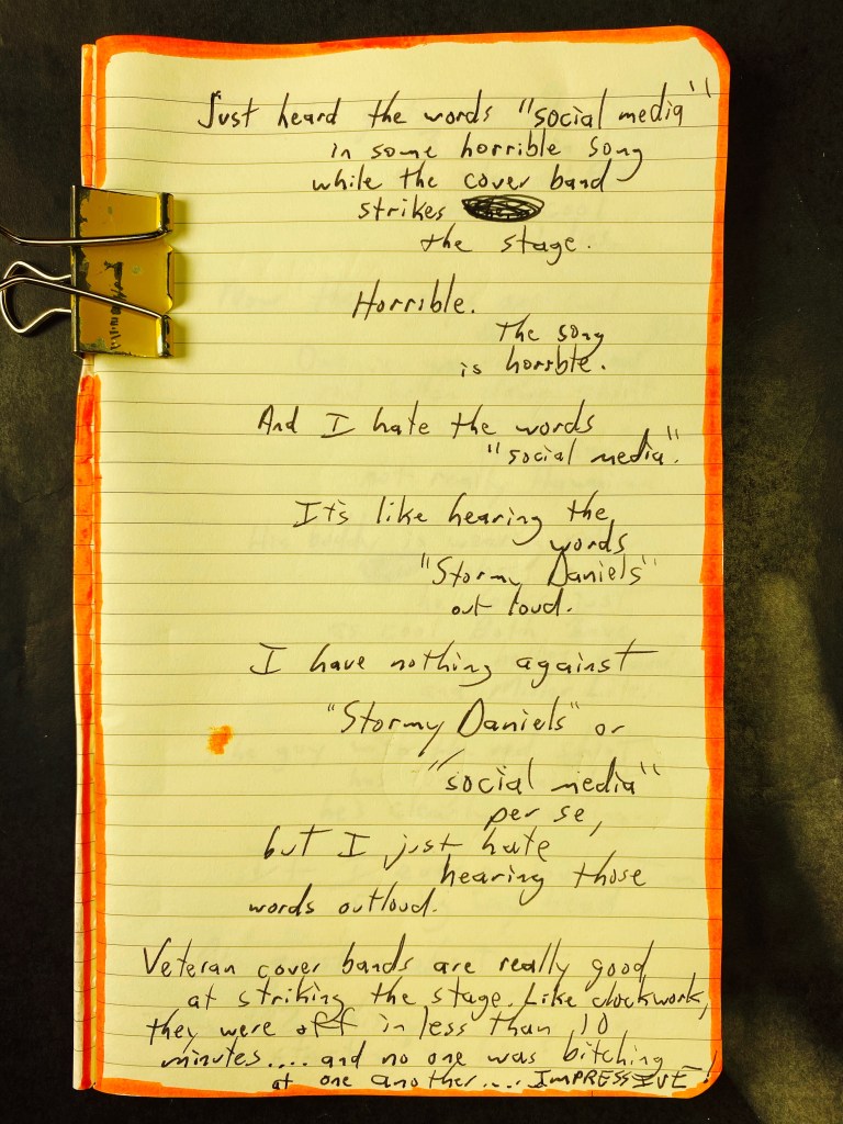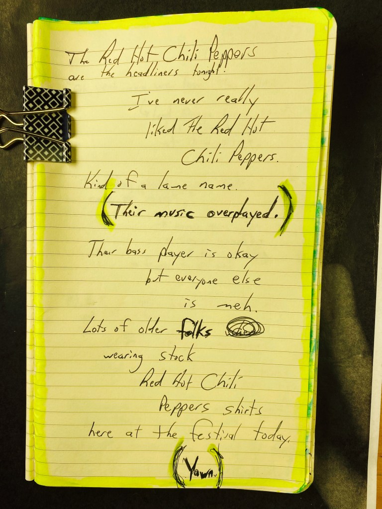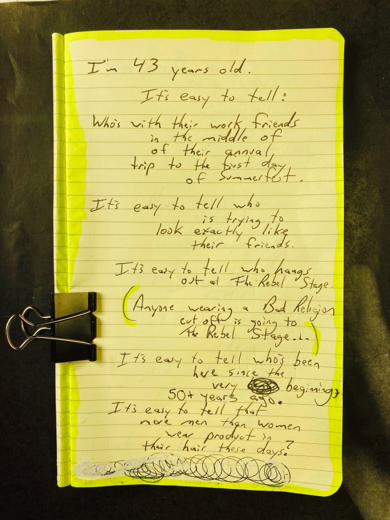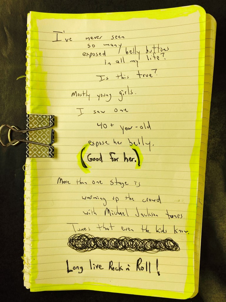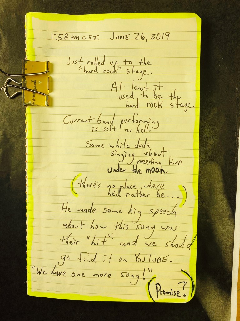Now at the hard rock stage: three-fourths of the band are in their mid-50’s and wearing sunglasses. Two of them are wearing hats to hide their receding hairlines, and the lead singer is unashamed of his receding hairline/balding head.