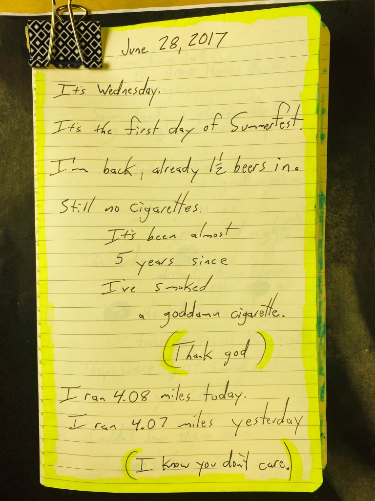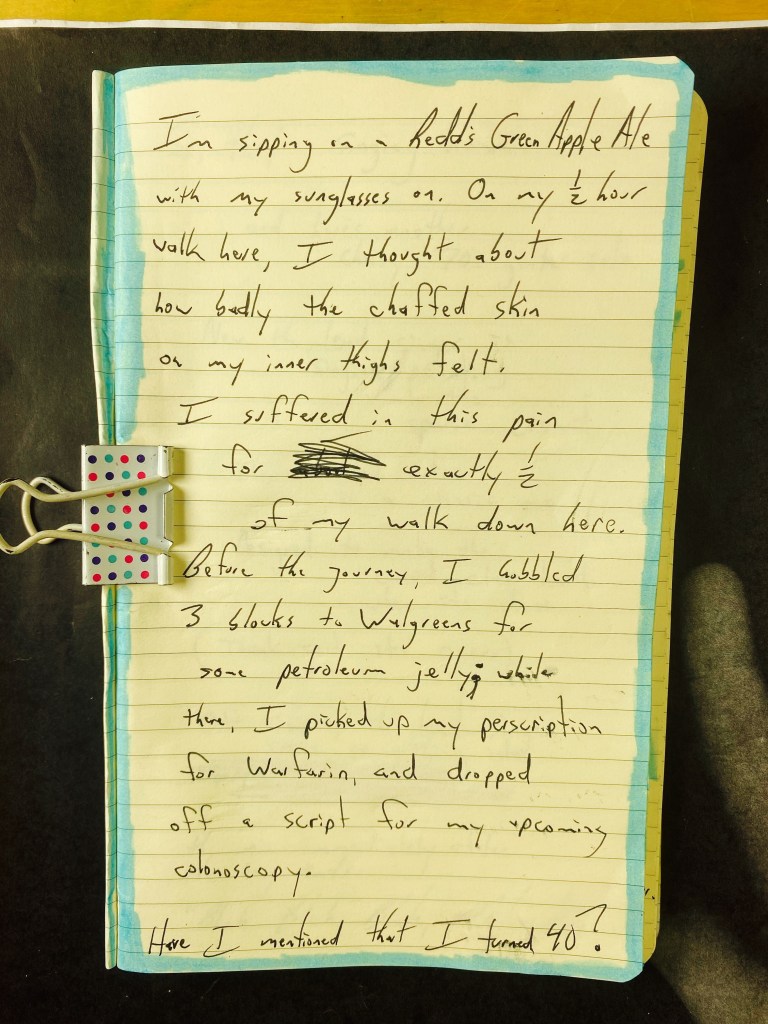 I’m sipping on a Redd’s Green Apple Ale with my sunglasses on. On my half-hour walk here, I thought about how badly the chaffed skin on my inner thighs felt. I suffered in this pain for exactly half of my walk down here.