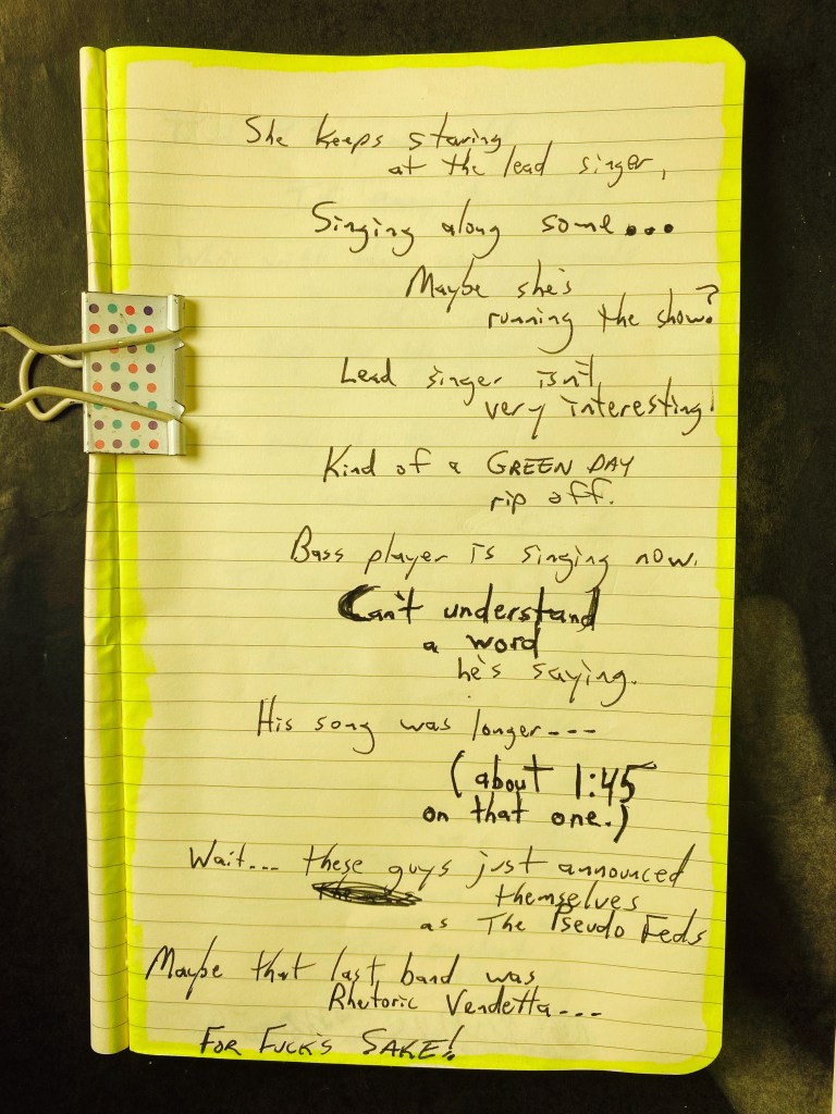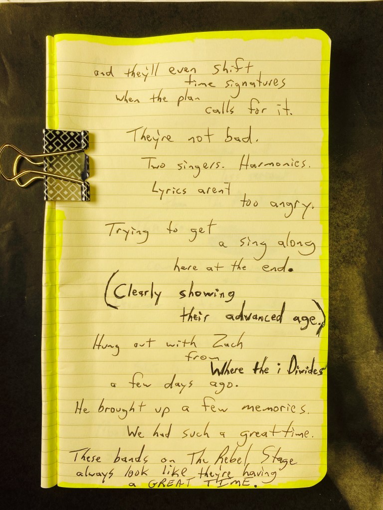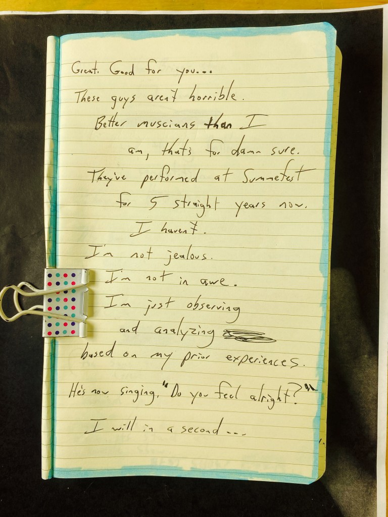 Here at the beta stage, some shit band just took the stage. Four in-shape men (clearly in their early 50’s) playing some long winded rock n’ roll instrumental with cheesy 1970’s guitar solos. All four were wearing sunglasses.