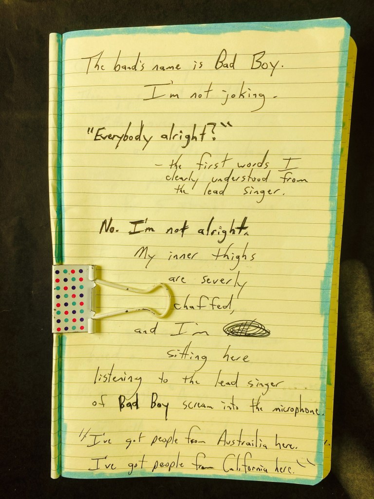 My inner thighs are severely chaffed, and I’m sitting here listening to the lead singer of Bad Boy scream into the microphone.